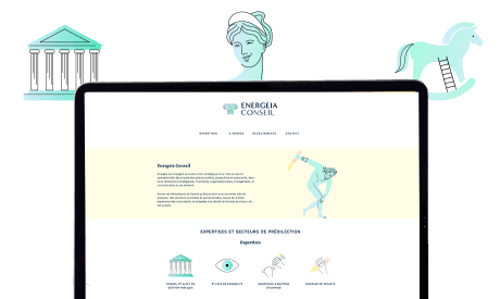 A Pour ce site, chaque image a été spécialement créée pour le site et donne cette ambiance simple et efficace. C'est ce qui était voulu par Energeia Conseil qui accompagne les acteurs publics, parapublics et associatifs, dans leurs dimensions stratégiques, financières, organisationnelles, managériales, et contractuelles. Le site a été réalisé avec le graphisme de Laure Barrière.