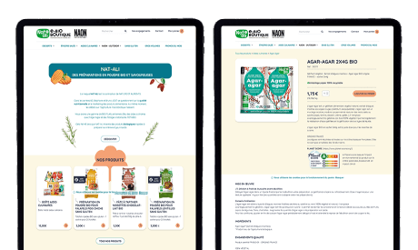 A Boutique en ligne de la marque Nat-Ali, des produits biologiques rapides à préparer soi-même, comme des flans, entremets, aides culinaires, potages ou encore de l'agar-agar. Pour cet e-commerce, le tunnel de vente a été simplifié au maximum, toutes les étapes étant accessibles depuis un même écran. La création d'un compte n'est pas nécessaire.