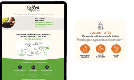 B Site avec une tendance pour les ronds, courbes et vagues. Cela peut traduire l'activité dans l'économie circulaire de Reflex : réduire et transformer vos déchets organiques en ressource locale, utile pour vous et la biodiversité. Nous avons fait le développement du site, la gestion de projet et le graphisme a été réalisé par Les pétroleuses.